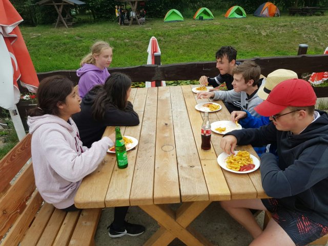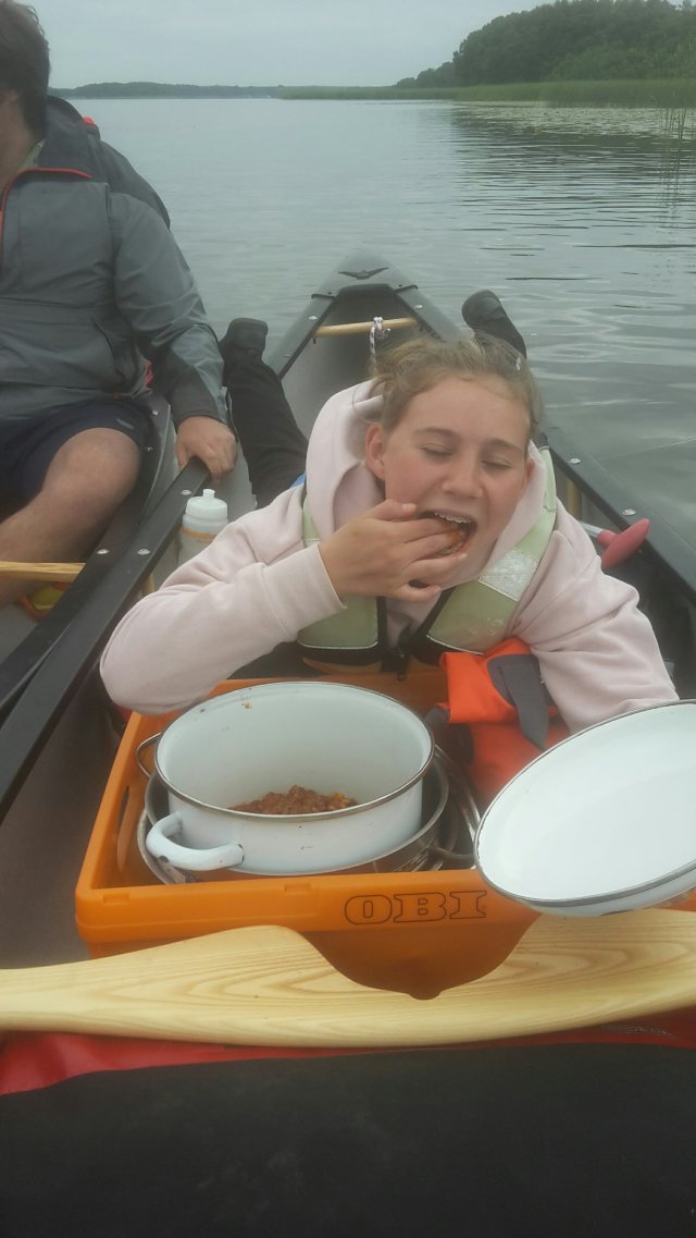 ach einer überraschend ruhigen Nacht, gab es ein ausreichendes Frühstück. Anschließend wurden wie immer die Kanus beladen und neu zusammengewürfelte Kanupaare nahmen Platz, um den Tag miteinander zu verbringen. Platsch! Die beiden schwersten Mitglieder der Gruppe mit dem schwersten Gepäck (die Essenskiste) waren fast beim einsteigen ins Wasser gefallen. Den ersten Teil der Tagesetappe ging es durch einen Kanal. Danach über einen kleinen Teil eines Sees, auf dem der Wind recht stark blies. Wellen und Wind von backbord. Eigentlich kein Problem mehr für uns. Einzig die beiden schon erwähnten schweren Jungs, also eher ein schwerer Junge und ein Baby Elefant, hatten hier ein bisschen zuviel zu kämpfen. Gott sei dank kamen schließlich alle an. Eine Lore sollte uns helfen alle sieben Kanus von einem See in den anderen zu bringen, doch da erblickten wir den Schleusenwart, der uns schließlich durch die Schleuse fahren ließ. Oben abgekommen mussten wir nochmal die Bootsbesatzungen durchtauschen, schließlich hatten wir einen langen See mit viel Wind noch vor uns und unsere Essenskiste wollten wir nicht einbüßen. Zeitgleich erfuhren wir, dass wir etwas heute weiter fahren mussten, da auf unserem geplanten Campingplatz nicht genügend Platz war. Nach dem Useriner See, den wir dann doch sehr entspannt hinter uns ließen, gings durch ein paar kleine Kanäle Richtung neuem Campingplatz. Zuvor allerdings machte sich, während einer kurzen Pause, eine Mitreisende über den Chili Topf her! Mhh lecker. Am Ende einer langen Fahrt durch mehrere zugewachsene Kanäle, kamen wir etwas unterkühlt und fertig an. Unsere erste Blick fiel auf die Karte des Fischers: Pommes! Und die helfen immer und beim allem. Bauchweh, Hunger, Kälte,…